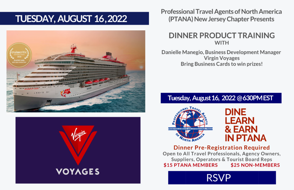 Join us on Tuesday, August 16, 2022 for a Dinner Meeting and meet Danielle Manegio of Virgine Voyages. Learn how this cruise partner can help you grow sales and dollars for your agency!