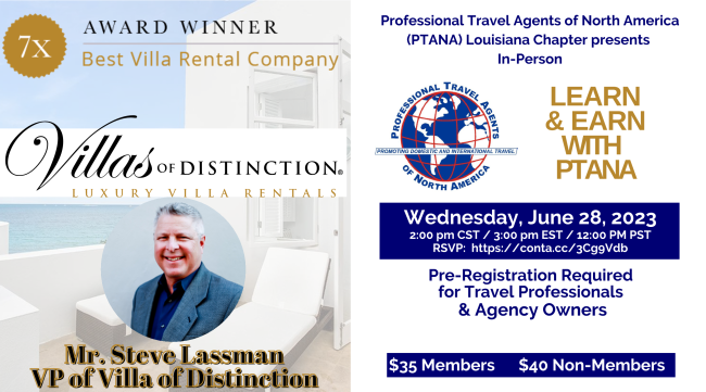 Join the Louisiana Chapter of Professional Travel Agents of North America (PTANA) for an upcoming Lunch or Dinner, Learn and Earn Experience with an in-depth Product Training from Villas of Distinction